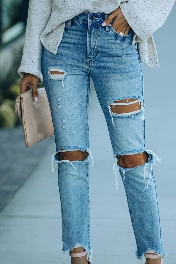 Light wash distressed skinny jeans. Classic light wash, stretch denim features a high waist, five pocket cut, belt loops, top button, and zip fly. Skinny pant legs have distressing, and asymmetrical raw hems. Hidden zip fly.