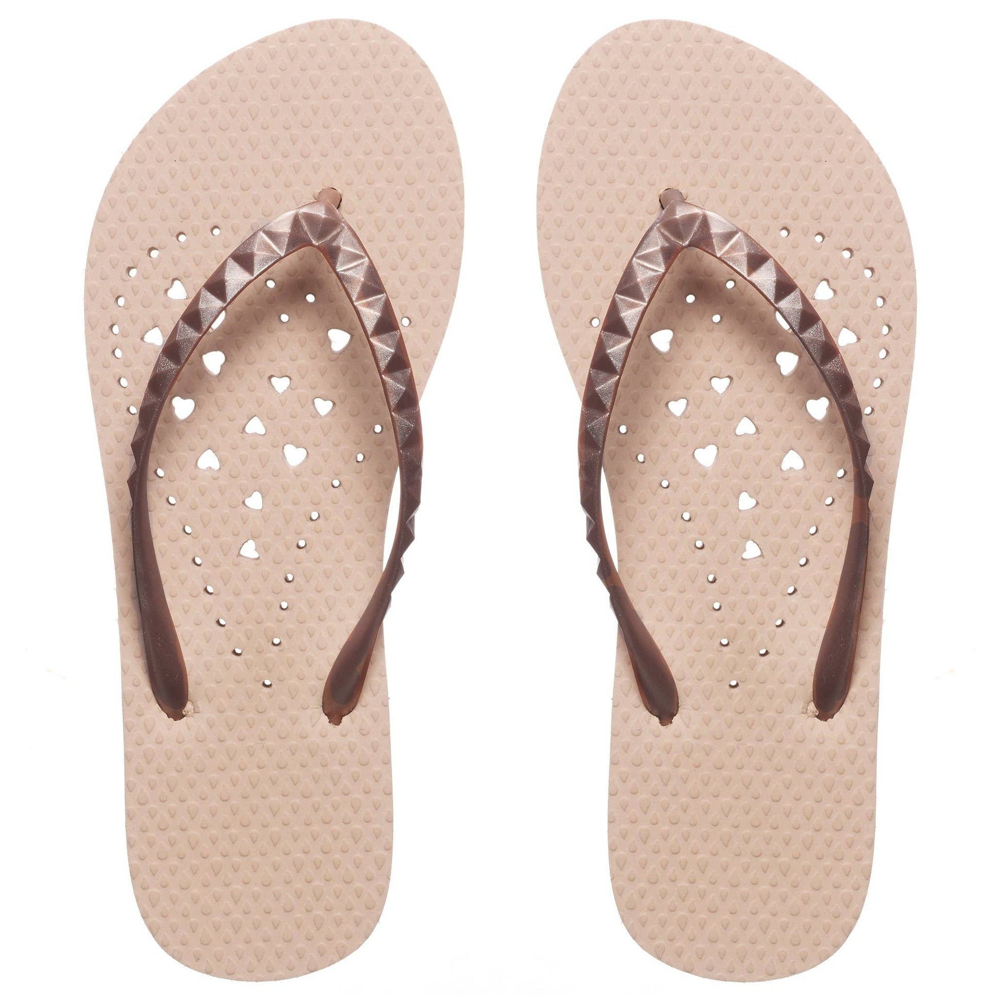 Perfect for the beach or a day at the spa. Rose colored foot bed with heart cut outs and metallic rose gold pyramid stud strap. One of our new faves for the Summer!