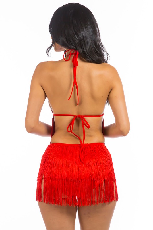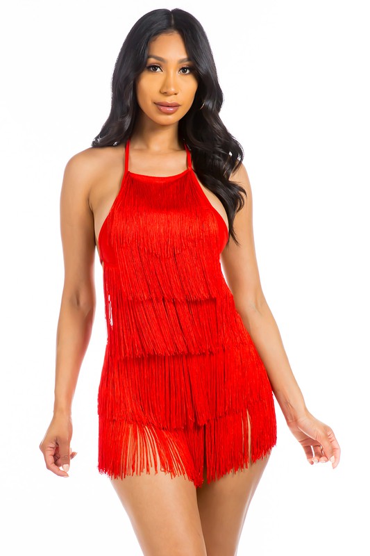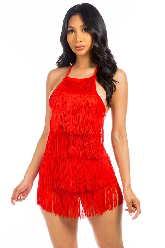 Details-stirp neckline,sleeveless ,multi tassels design, open back